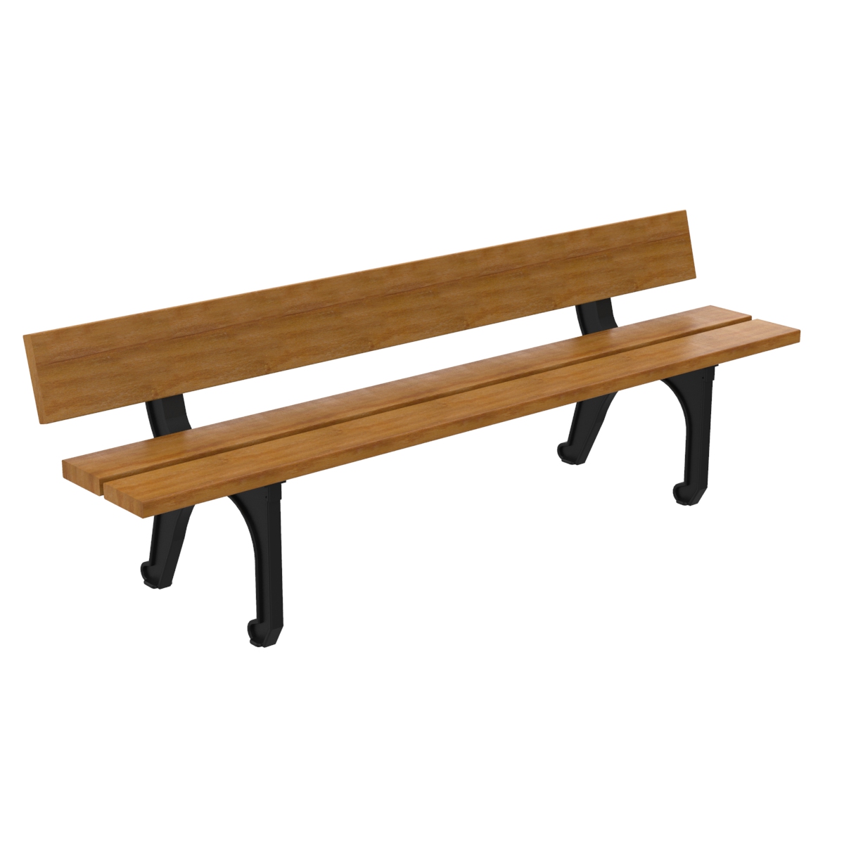 Banco modelo Bilbao, con soportes de fundición dúctil con acabado en oxirón y listones de madera tropical.