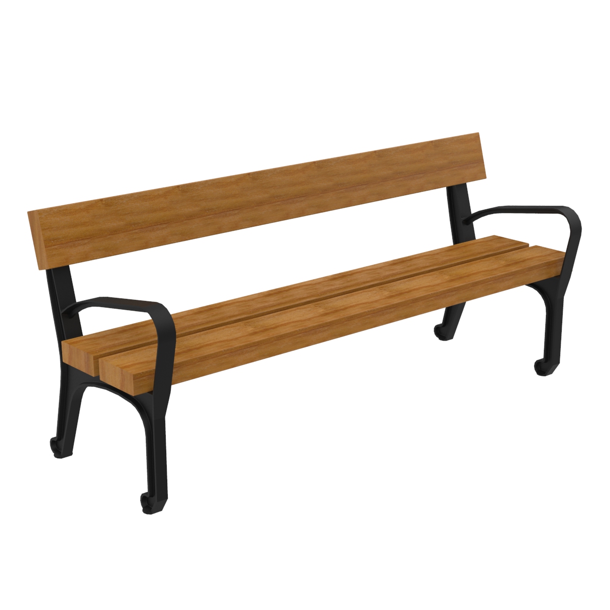 Banco modelo Vitoria con apoya-brazos, soportes de fundición dúctil con acabado en oxirón y listones de madera tropical de 2000×40 mm de grosor.