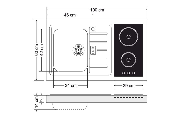 - Encimera de acero inoxidable, interruptores adelante, fregadero, juego de desagüe y de rebose, perforación para grifo de 35 mm, dos placas de cocción eléctrica, vitrocerámica o encimera sin