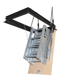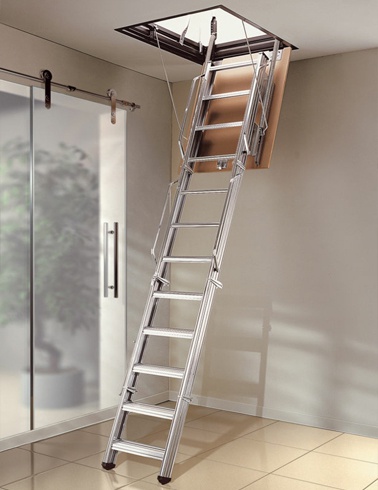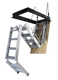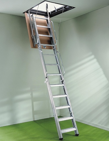 Formada por 4 tramos que quedan plegados encima de la tapa y no ocupan espacio en la habitación de la planta superior cuando la escalera permanece cerrada.