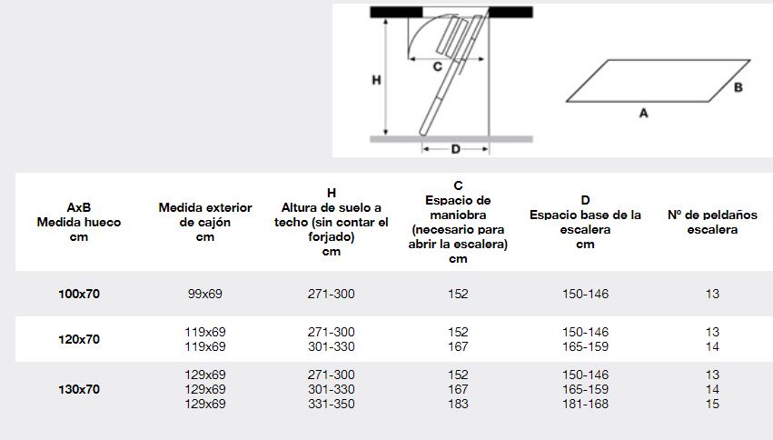 Su sistema de apertura obliga a prever un espacio de maniobra por delante del cajón, necesario para abrir la escalera.